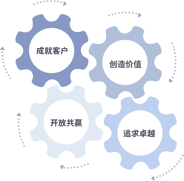 成就客户是一切决策的出发点,,,创造价值是衡量所有工作的标准,,追求卓越是我们做事做人的态度,,开放共赢是我们的格局也是最终的结果。。。价值观的齿轮环环相扣,,,推动着组织里的每个人不断向前。。。