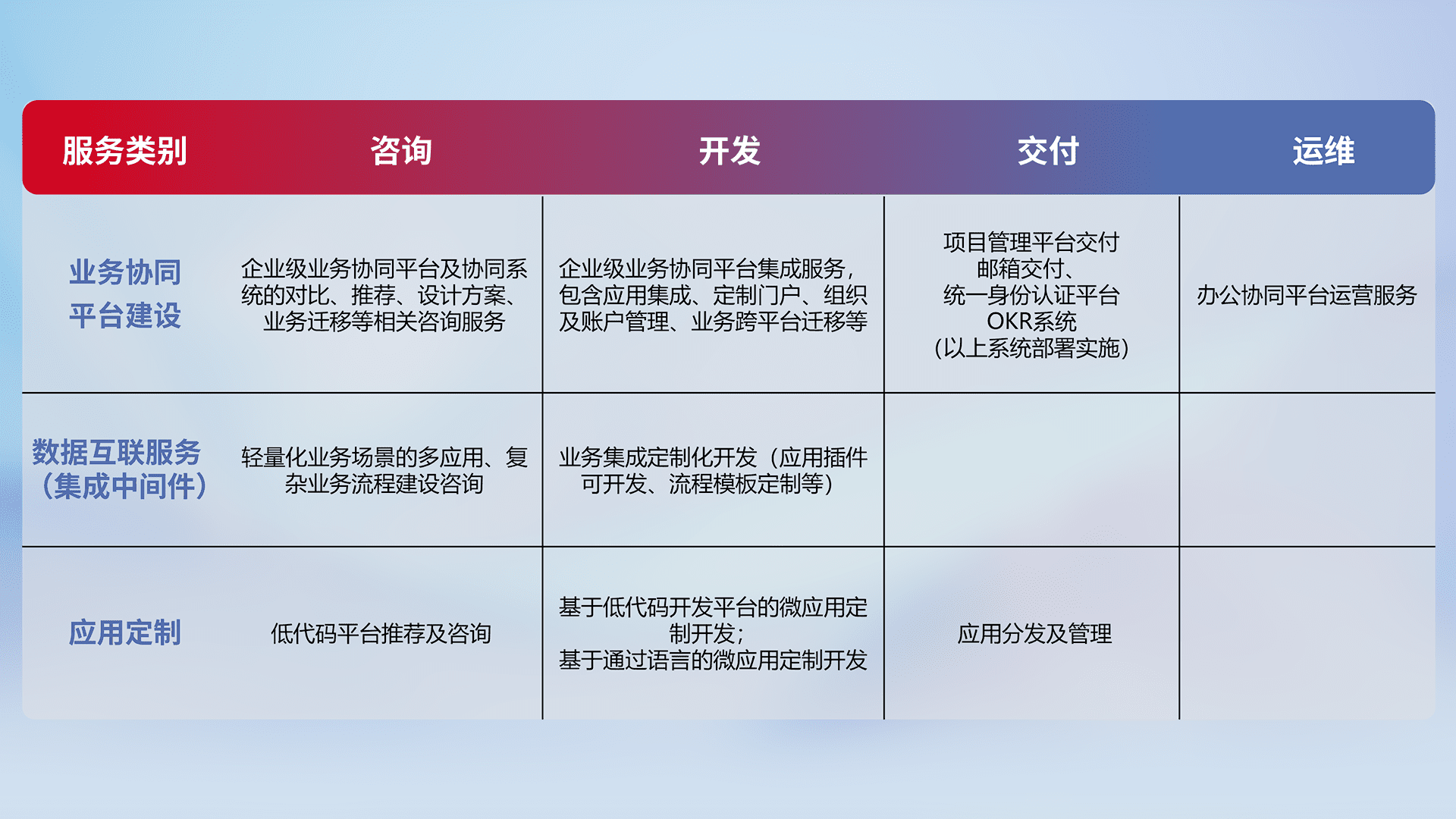 针对钉钉、、、、企微、、、IDaas等平台级产品提供产品的规划、、、、方案、、交付、、、、定制化开发等服务,,,,实现如统一协同办公、、、、智能客户服务、、、、混合会议管理、、智能数据查询、、、等业务场景,,实现数字化转型。。。